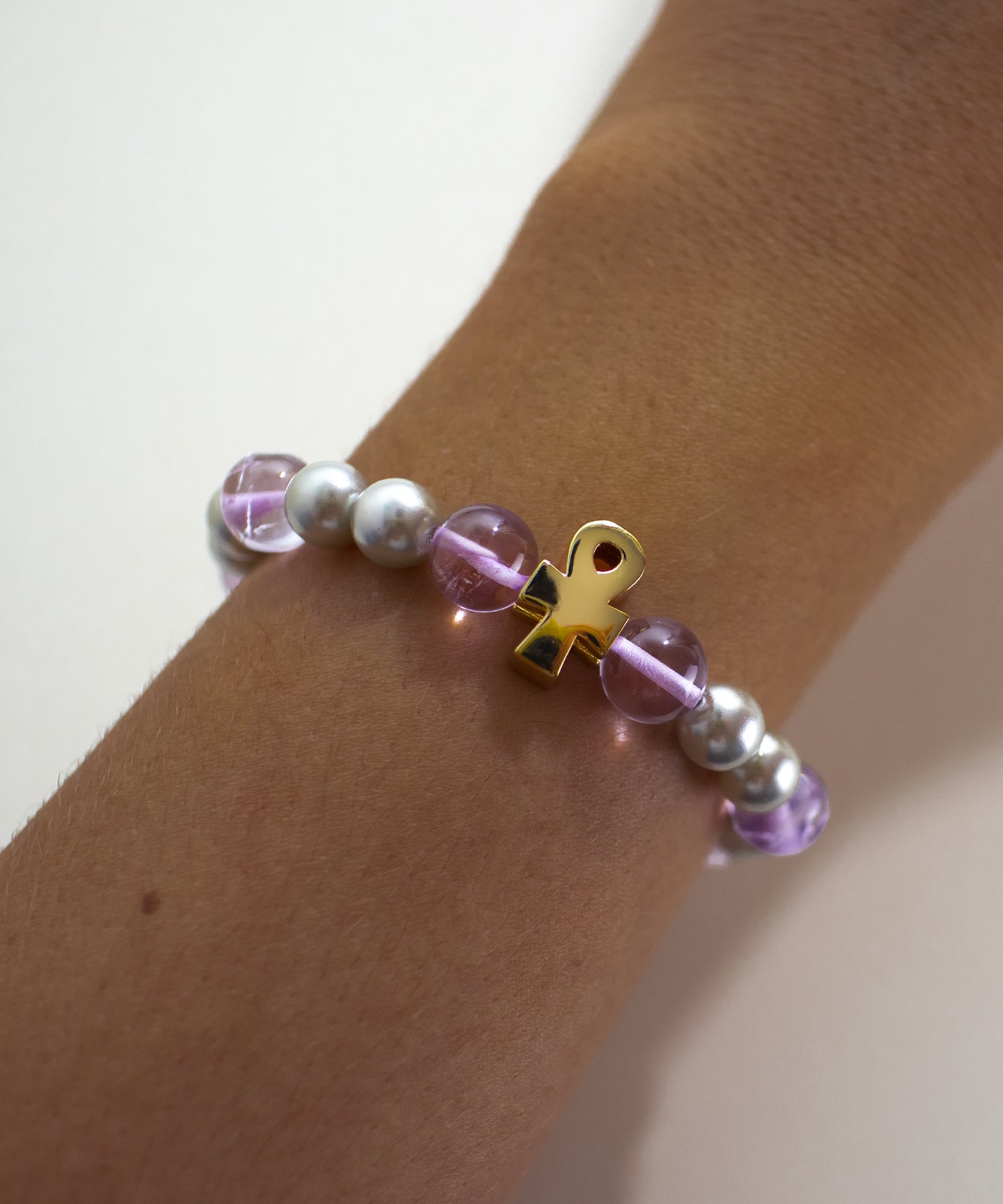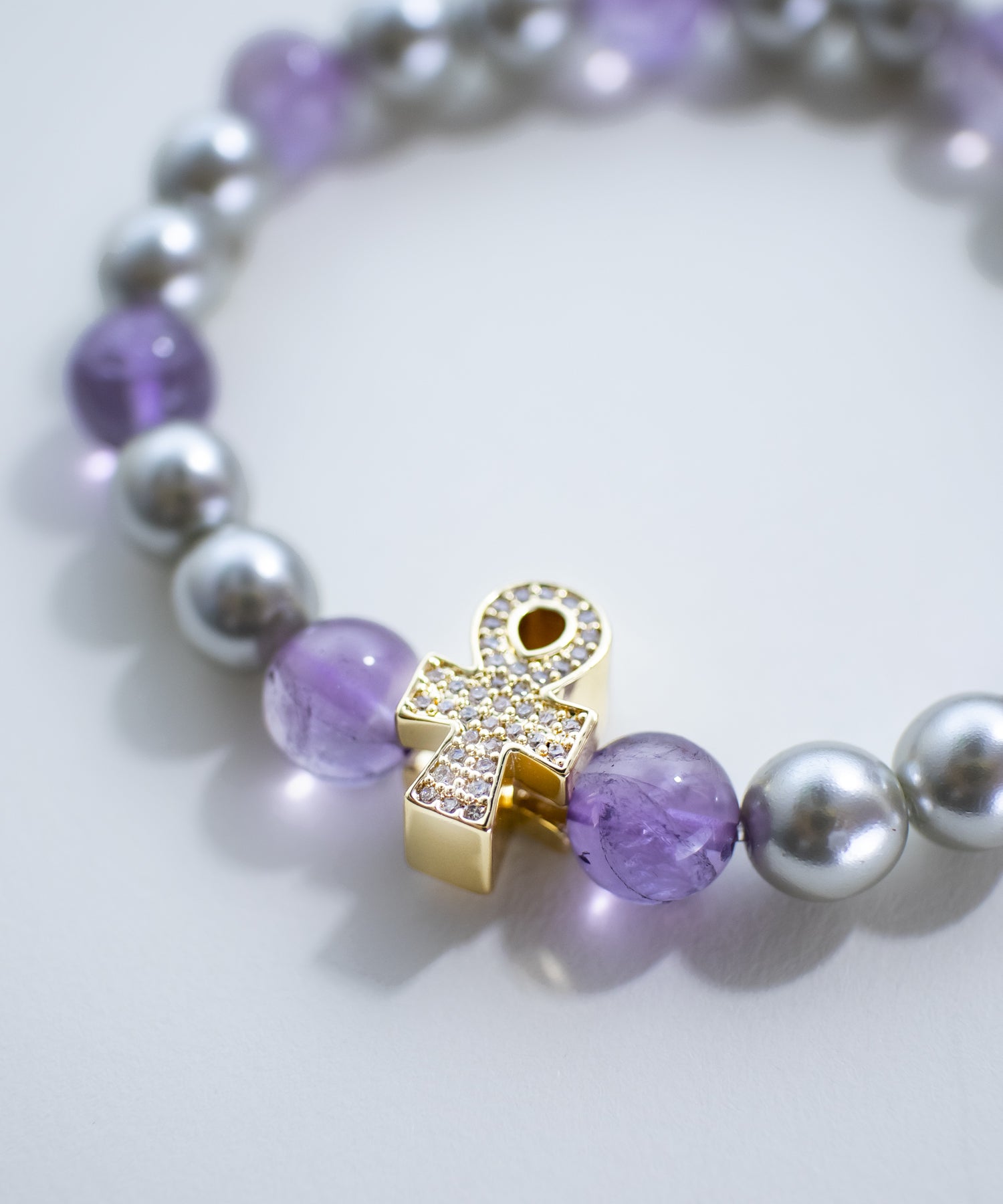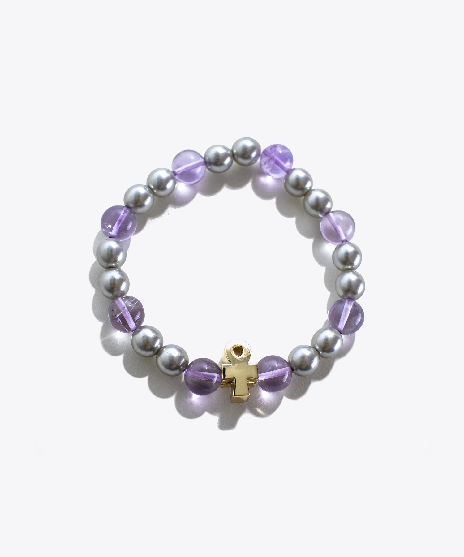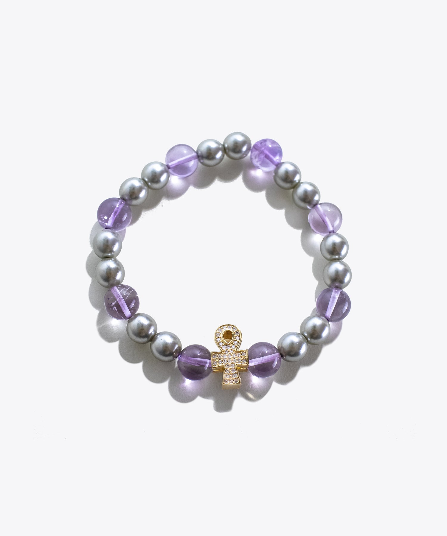 Amethyst and pearls with a centered ankh charm. This unisex bracelet stretches to fit most wrists. Choose between the plain ankh charm and CZ stones ankh charm.