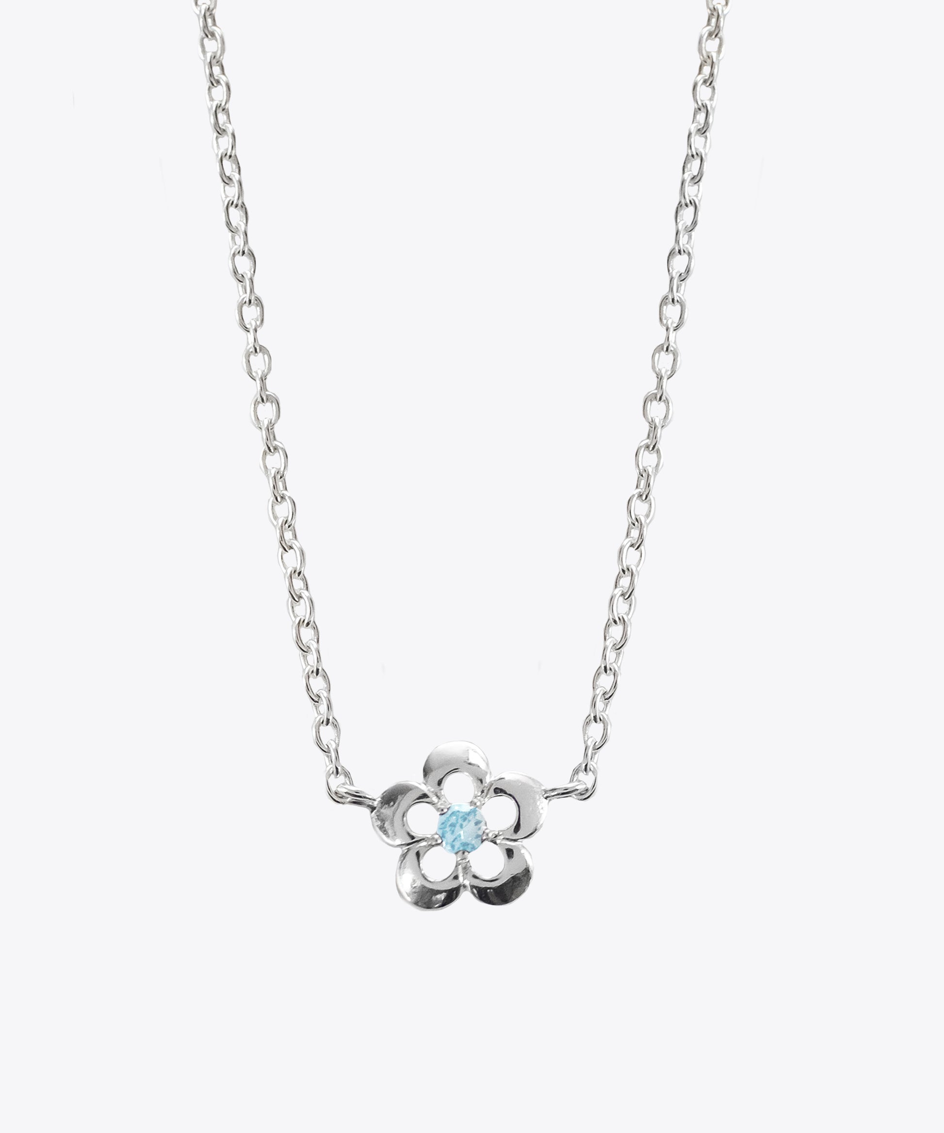A sterling silver necklace with centered cutout daisy. Aquamarine stone detail.