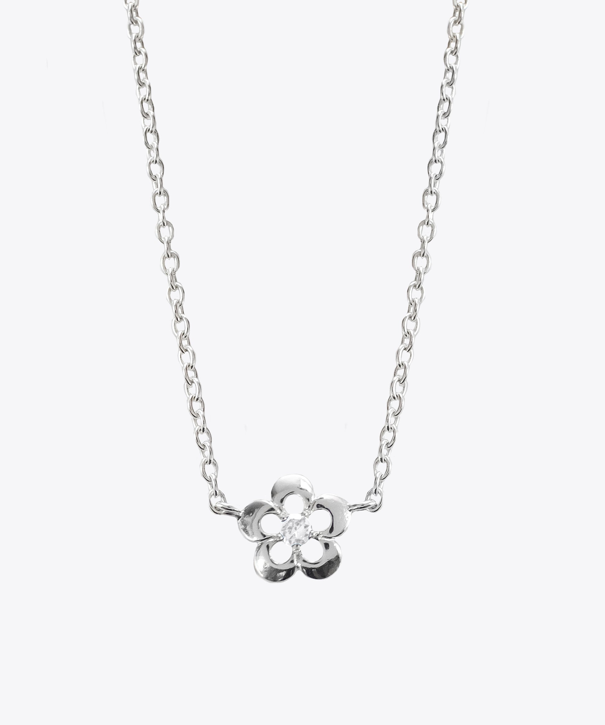 A sterling silver necklace with centered cutout daisy. CZ stone detail.