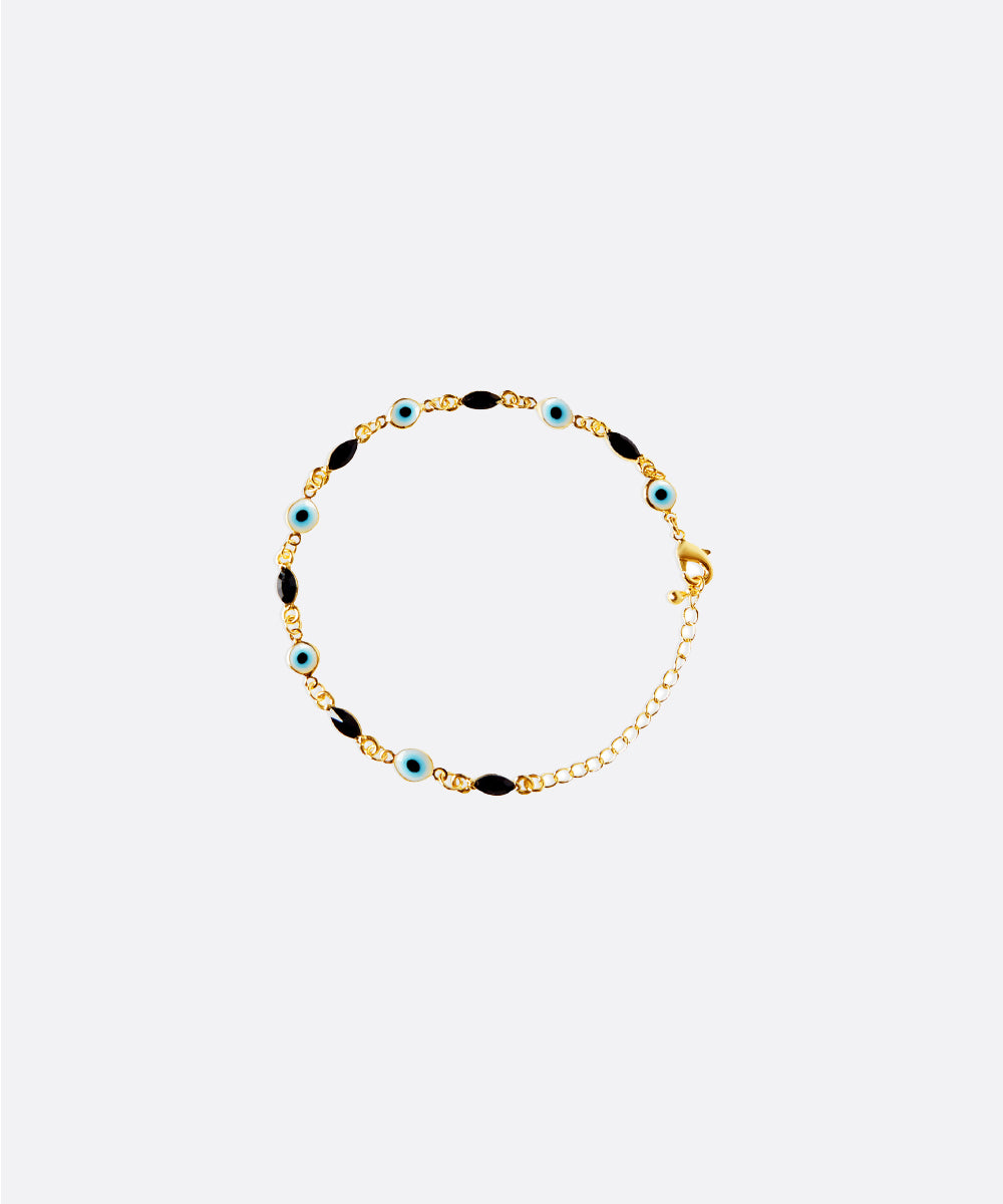 White and blue evil eye charms and black faceted stones on a chain bracelet/anklet. This piece is meant to be a bracelet flex anklet, which can be worn on both areas with a maximum size of 9" inches.