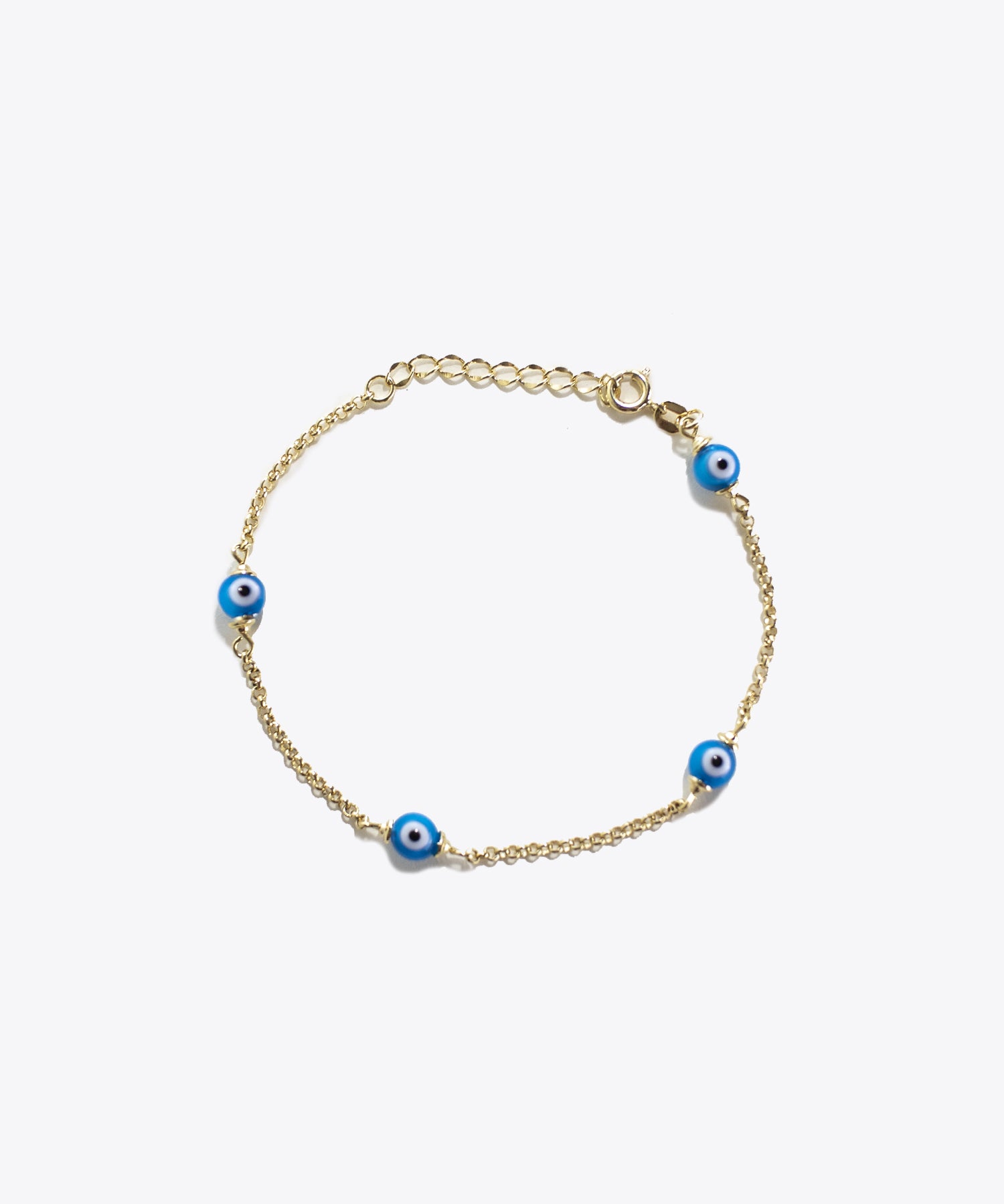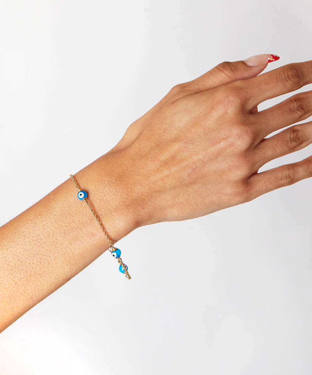 Blue evil eye charms a chain bracelet/anklet. This piece is meant to be a bracelet flex anklet, which can be worn on both areas with a maximum size of 9" inches.
