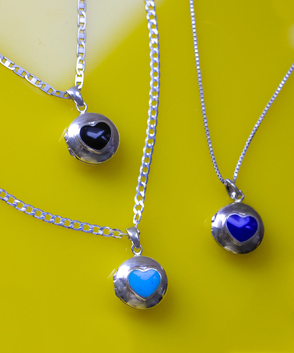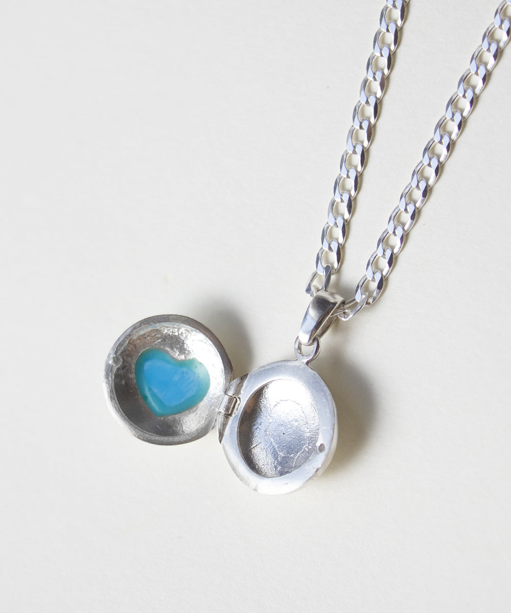 Circular heart locket pendant with turquoise stone detail. The pendant opens up. Available on the chain of your choice. Pendant and chain are heirloom 925 sterling silver.